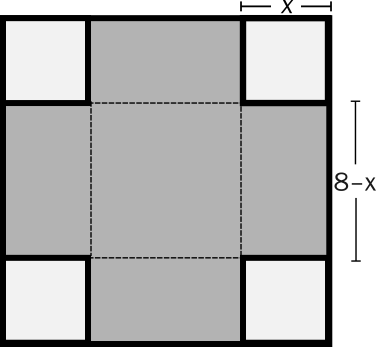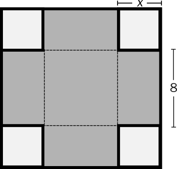 1. Square of side length 8 with square corners of side length \(x\) removed
